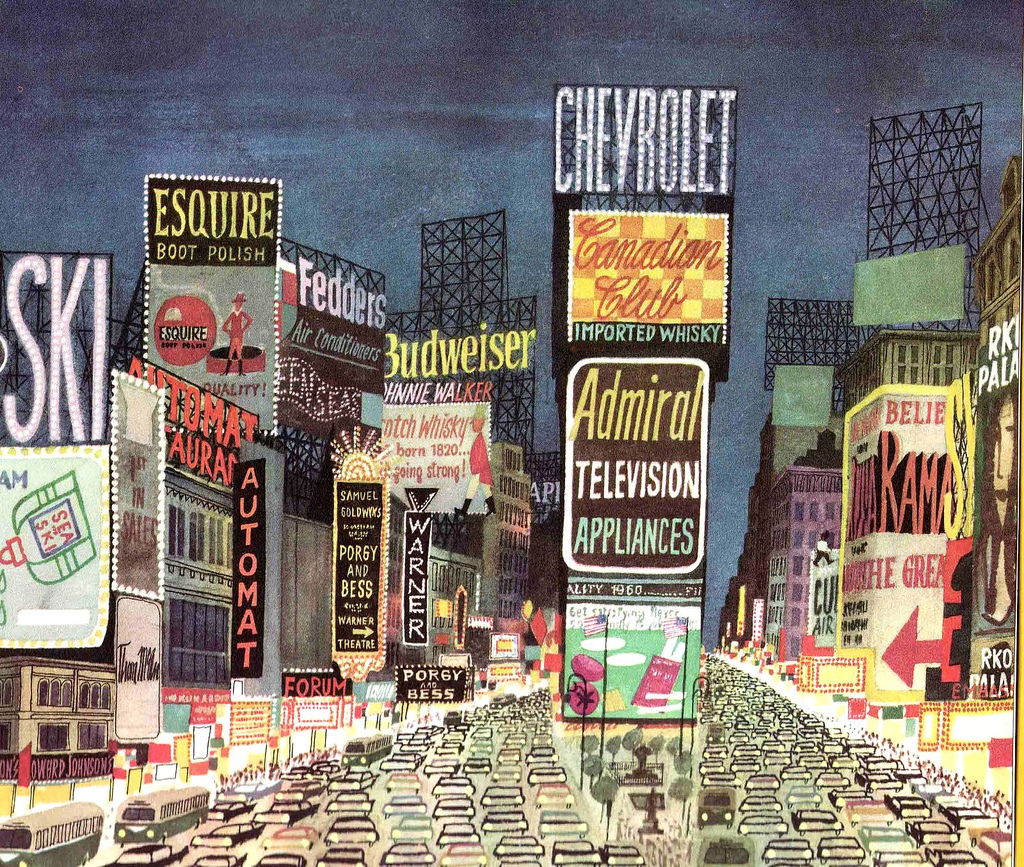 Today, another generation of children and adults alike are enjoying Miroslav Sasek’s classics. (Reissued since 2004) The elegant 50’s style of illustration is what grabs your attention first. The text is a little old fashion, but don’t let that put you off. His cities are playful, imaginative and detailed. The cities inhabitants are also whimsical and fun to look at. His enchanting world even manages to bring to life all the small things like shopfronts, people at the drive in, children playing, traffic and transport.