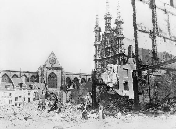 Two women in the city of Louvain make their way through the rumble near the Hotel de Ville.