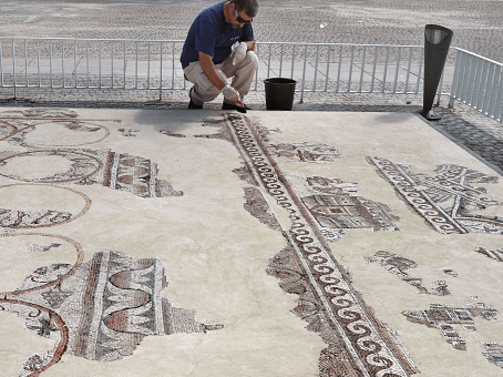 A very rare Egyptian streetscape mosaic in the Kiryat Gat Industrial Park, in Israel, will be open to the public for viewing tomorrow on October 1st. Two years ago the 1,500 year-old Byzantine Mosaic was removed from the site for conservation purposes by the Israeli Antiquities Authority. Now, finally back at the original site, locals and tourists will be able to gaze at the mosaic pavement, depicting streets and realistic buildings of, what is according to a Greek inscription on the mosaic, the settlement of Chortaso (Kartasa) in Egypt. Beneath the wonderful images of the settlement lies the Nile River featuring a sail boat. On another section of the preserved mosaic, images of animals and a special goblet with red fruit are portrayed in amazing detail. Israeli Antiquities Authority archeologists state that the mosaic artist used seventeen different shades of coloured stones.