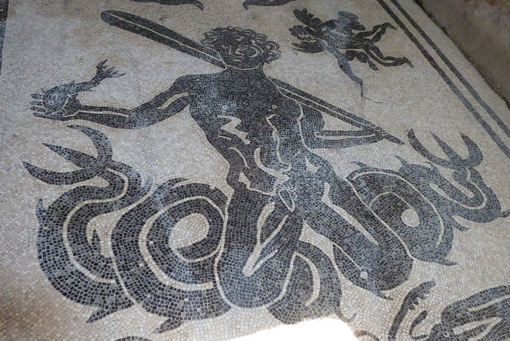 In the women’s central baths in Herculaneum is a wonderful mosaic featuring Triton, the son of Neptune. It is surprisingly intact, showcasing Triton in all his glory. It seems fitting that he sits at the bottom of the bath with his curling sea serpent tail (legs), surrounded by (though not shown here) leaping dolphins, an octopus and other sea creatures.