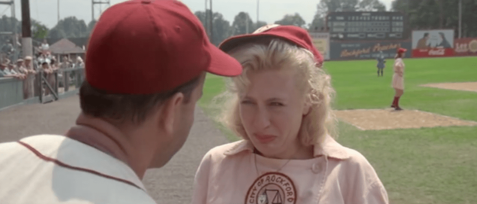 One of the most memorable scenes from the film involves the ever-reliable Tom Hanks as Jimmy Dugan, a down-and-out ex-player turned coach and one of his young protégés, Evelyn Gardner, played by Bitty Schram. In the lead up to the scene, Evelyn makes a blunder in one of Rockford’s games that cost them dearly and Dugan (Hanks) is not happy. When Dugan calls over Evelyn, diplomacy is quickly thrown out the window as he explodes in a verbal tirade. Evelyn does her best to compose herself but can’t which leads to one of the film’s greatest lines, “There’s no crying in baseball.” It is a scene that is both awkward and funny. It highlights the fine line Dugan must tread in his role as coach as he attempts to shape the Rockford Peaches into a winning team. Although he later comes to admire the young women under his tutelage, this scene shows, the pressure he is under and his inability to accept losing or failure, arguably a reflection of his own insecurities and a stellar career he ruined by being a roaring drunk.